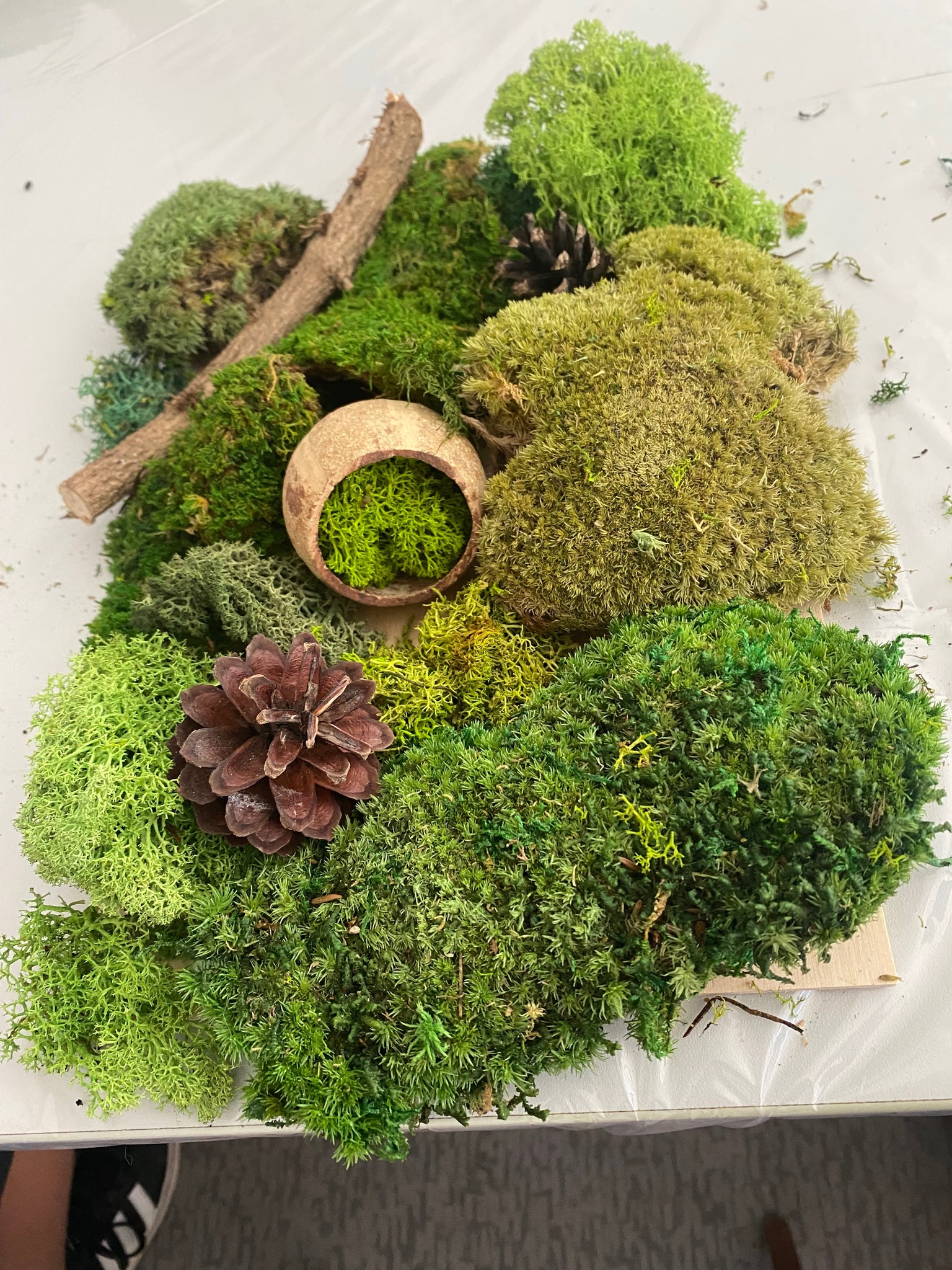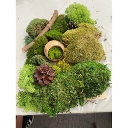 - rośliny, mech, kamienie, wstążki, bombki, szyszki, brokaty.